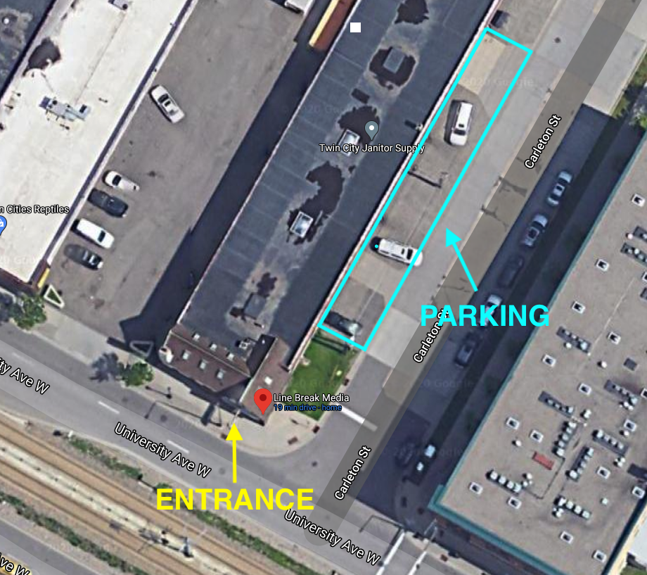 The street address is 2345A University Ave W, St Paul, MN 55114. It’s a big brick building that somewhat resembles a house and is attached to Twin Cities Janitor Supply. You can park along the east side of the building in spots marked “Line Break”.